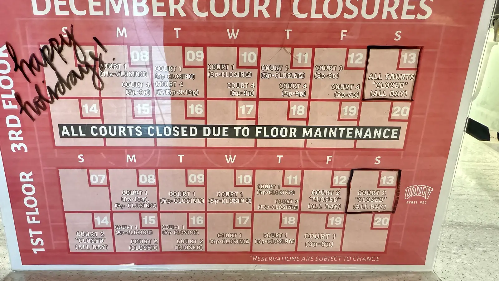 by Admin UNLV Rec Center Maintenance Closure until 12/21 Published: Sunday, December 14, 2025 3:15:43 PM Courts are closed until 12/21/2025